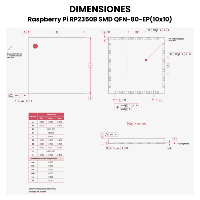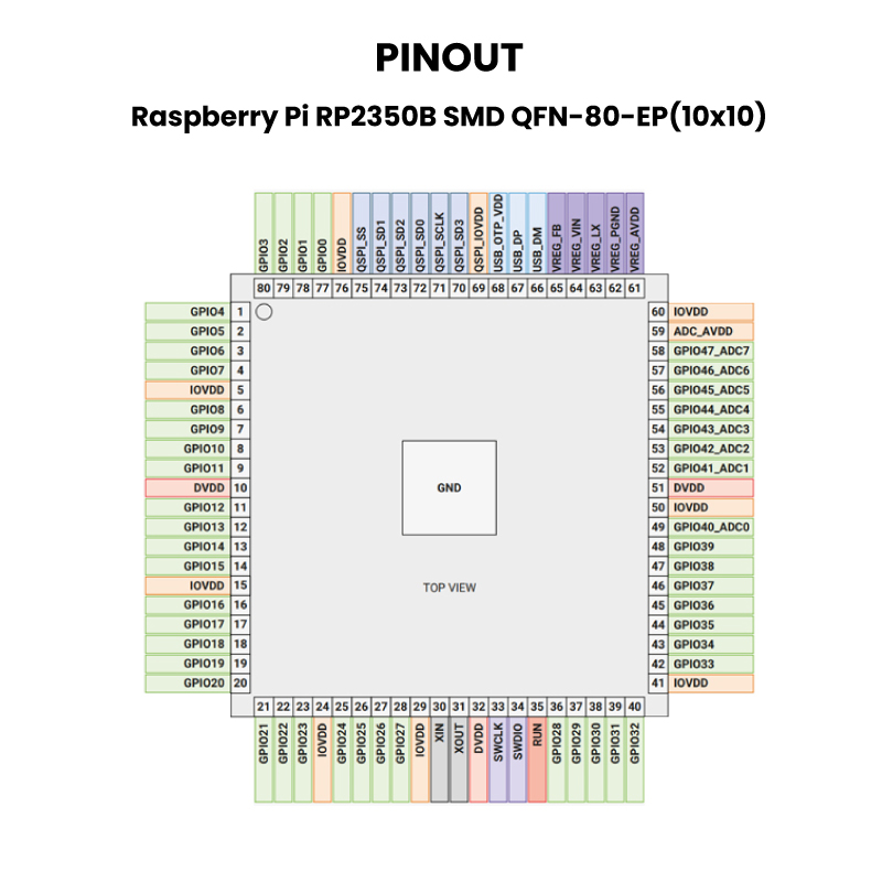 El Raspberry Pi RP2350B es un microcontrolador de 32 bits diseñado por la Fundación Raspberry Pi, sucesor del popular RP2040. Está orientado a aplicaciones embebidas que requieren alto rendimiento, seguridad avanzada y eficiencia energética con encapsulado QFN-80: “Quad Flat No-lead”, EP (Exposed Pad) que tiene una “almohadilla expuesta” en la parte inferior para mejorar la disipación de calor y el aterrizaje eléctrico.