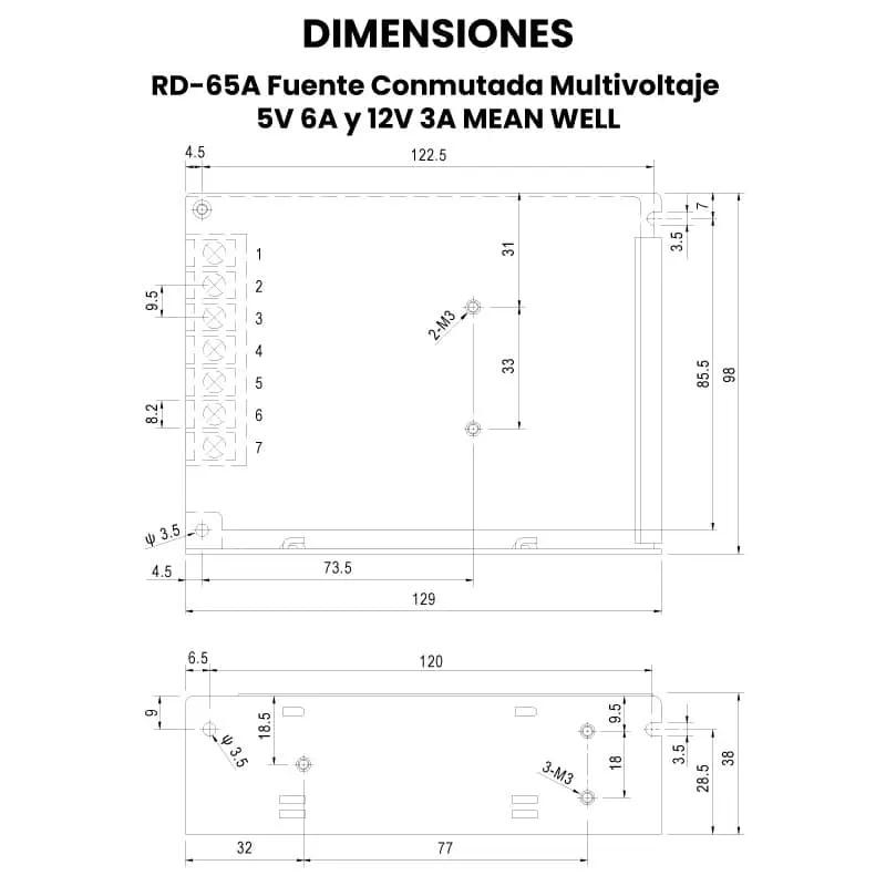 La RD-65A de MEAN WELL es una fuente de alimentación conmutada de salida dual que convierte corriente alterna en dos líneas de voltaje independientes: 5 V DC a 6 A y 12 V DC a 3 A, permitiendo alimentar distintos circuitos desde un solo equipo. Está diseñada en un formato compacto con carcasa metálica tipo malla para enfriamiento por convección natural, y trabaja con entrada universal de 100 a 240 V AC, lo que facilita su integración en equipos electrónicos, sistemas de control y aplicaciones industriales donde se requieren múltiples voltajes.