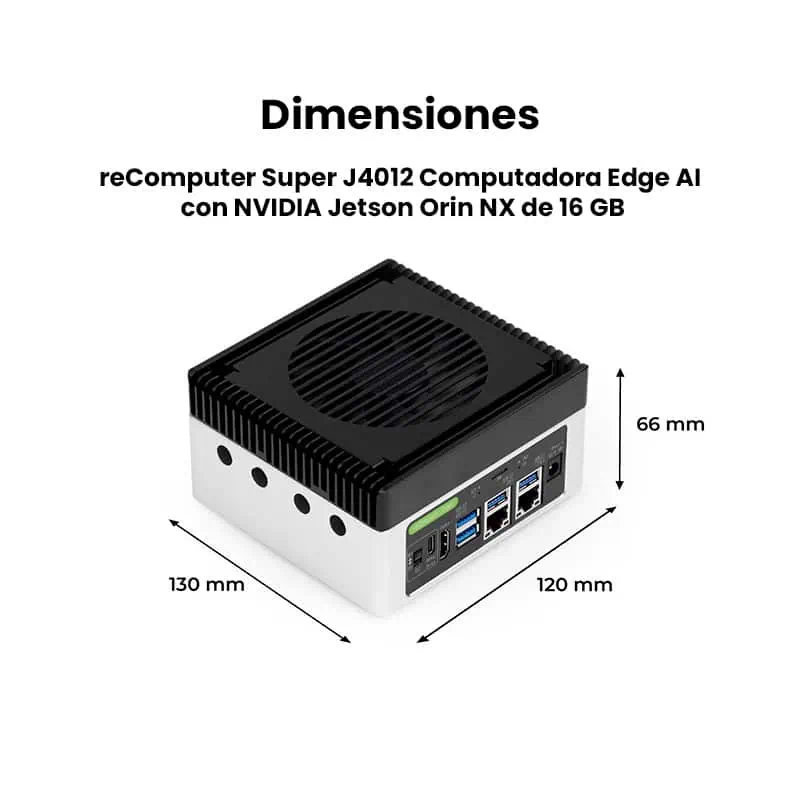 La reComputer Super J4012 con NVIDIA Jetson Orin NX de 16 GB es un dispositivo compacto y potente diseñado para el desarrollo e implementación de aplicaciones de Inteligencia Artificial en el Borde (Edge AI). Integra el módulo Jetson Orin NX, optimizado para ejecutar modelos de IA directamente en el dispositivo, sin depender de la nube.