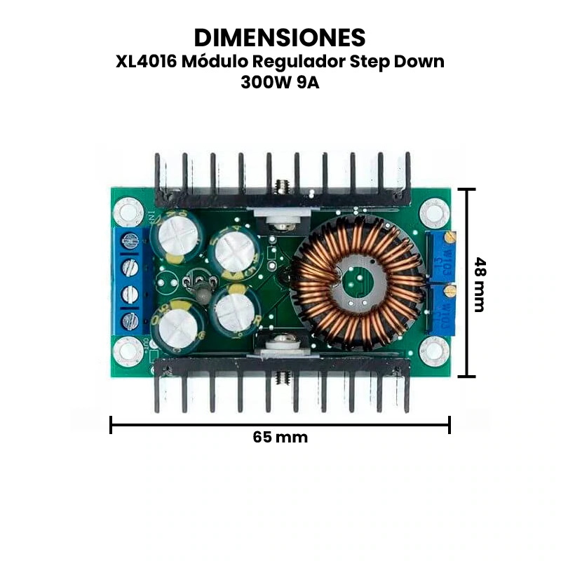 El XL4016 Módulo Regulador Step Down 300W 9A es un convertidor de corriente continua (DC-DC) tipo buck diseñado para reducir un voltaje de entrada más alto a un voltaje de salida más bajo de forma eficiente, con capacidad de manejar hasta 300 W de potencia y 9 A de corriente continua. Su funcionamiento se basa en la modulación por ancho de pulso (PWM), controlada por el chip XL4016, que regula la apertura y cierre de un transistor de conmutación para transferir energía a través de una bobina, suavizada posteriormente por capacitores. Mediante un potenciómetro de ajuste, el usuario puede configurar el voltaje de salida deseado, manteniendo estabilidad incluso bajo cargas variables.
