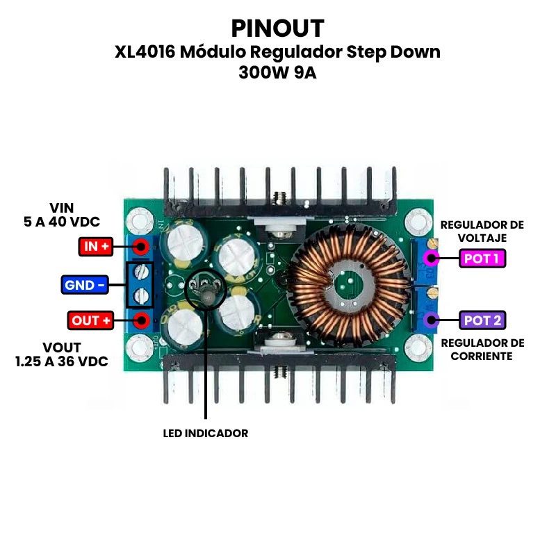 - Salida Máxima: 9A (Ajustable con potenciómetro).