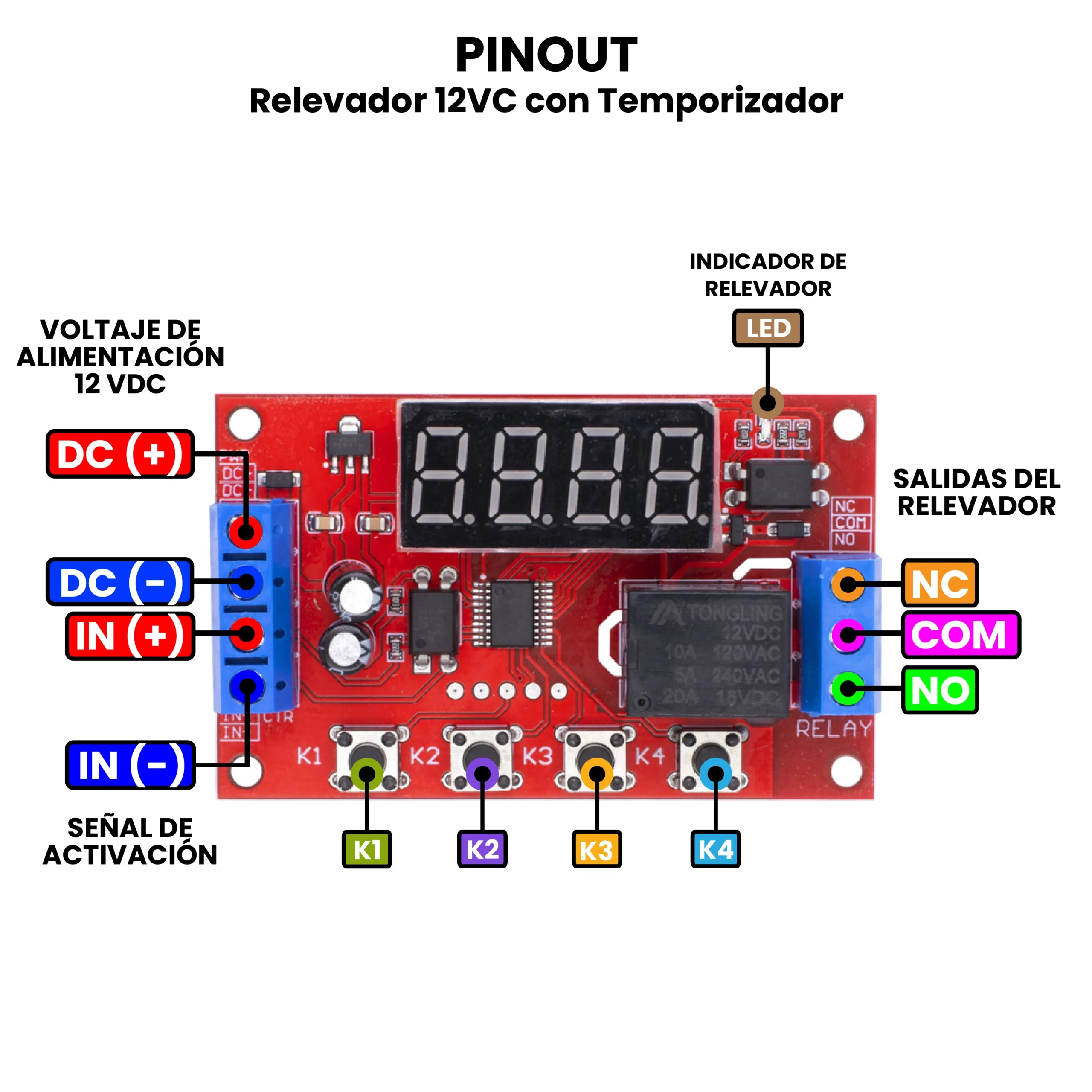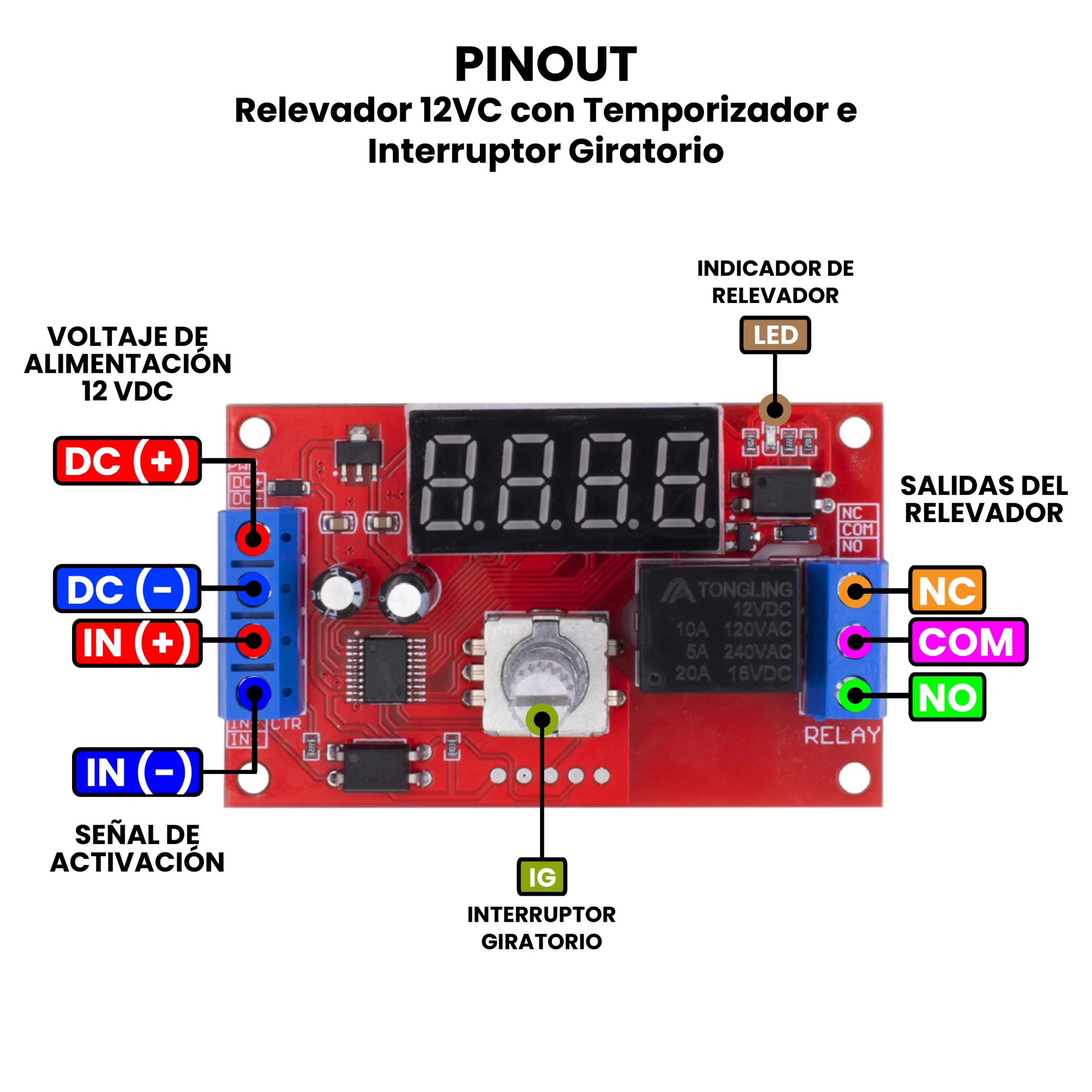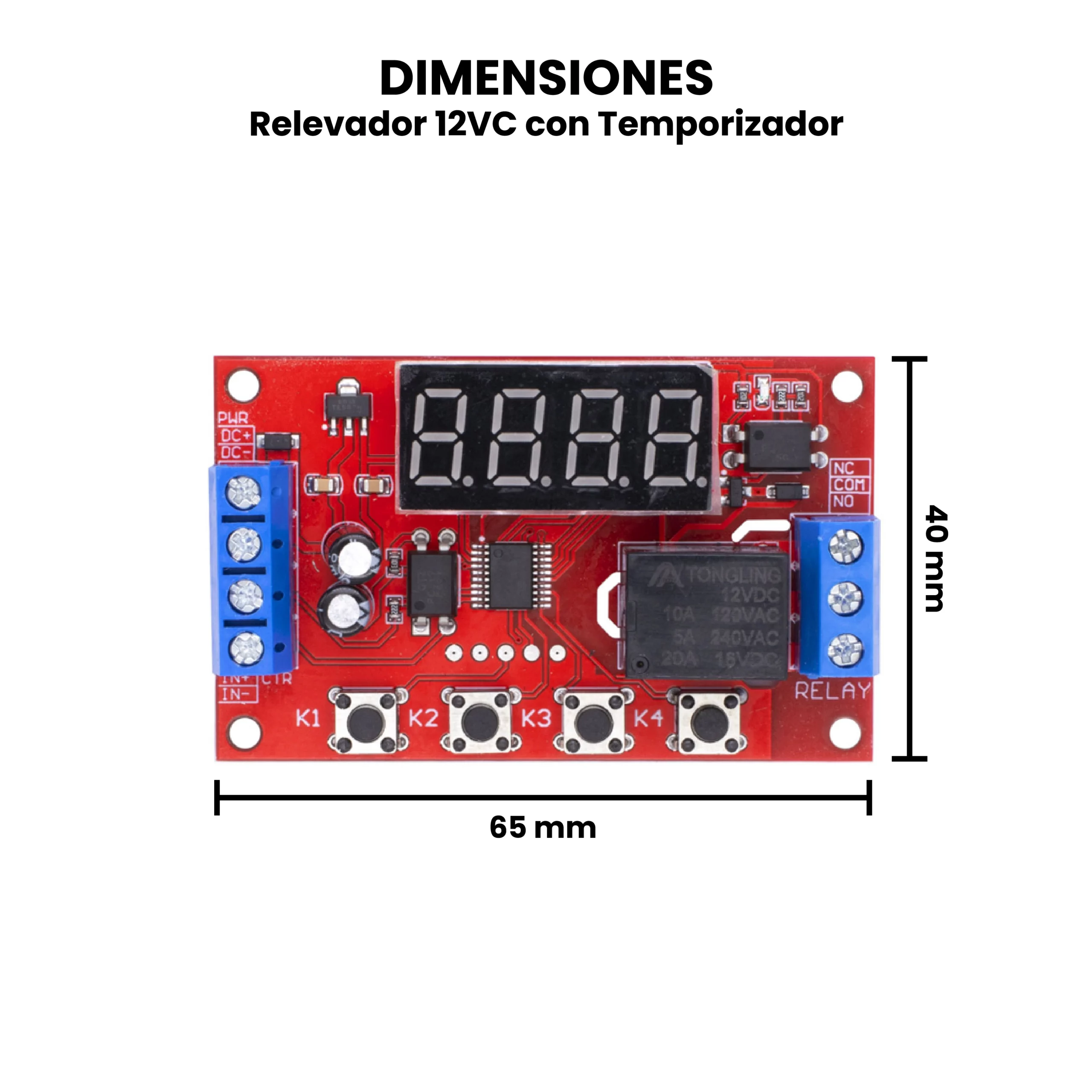 El Relevador 12 VDC Temporizador CON/SIN Interruptor Giratorio es un módulo electrónico que combina un relé de 12 V con un sistema de temporización ajustable, permitiendo activar o desactivar una carga eléctrica después de un tiempo definido (con diferentes funciones predeterminadas). Su función principal es controlar el encendido o apagado retardado de dispositivos, ya sea al recibir alimentación o mediante una señal externa. El temporizador puede configurarse mediante un interruptor giratorio (potenciómetro) cuando el modelo lo incluye, permitiendo ajustar fácilmente el tiempo sin programación; o sin interruptor giratorio, en cuyo caso la configuración se hace mediante botones. Una vez establecido el tiempo, el módulo activa o desactiva el relé tras contar el periodo seleccionado.