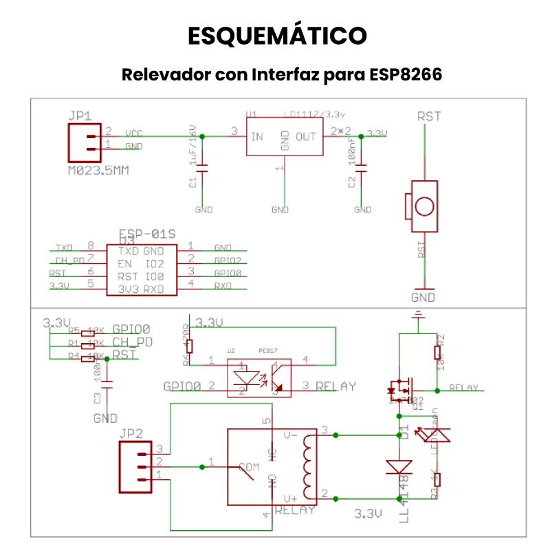 El Relevador con Interfaz para ESP8266 es un módulo para conectar un ESP-01S y controlar el relevador fácilmente mediante el GPIO0 del ESP, además este modulo cuenta con un botón de RESET, borneras para entrada de voltaje de 5V y conexiones para el relevador así como un led indicador que permite visualizar cuando se activa el relevador.