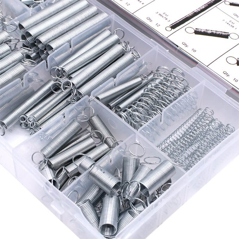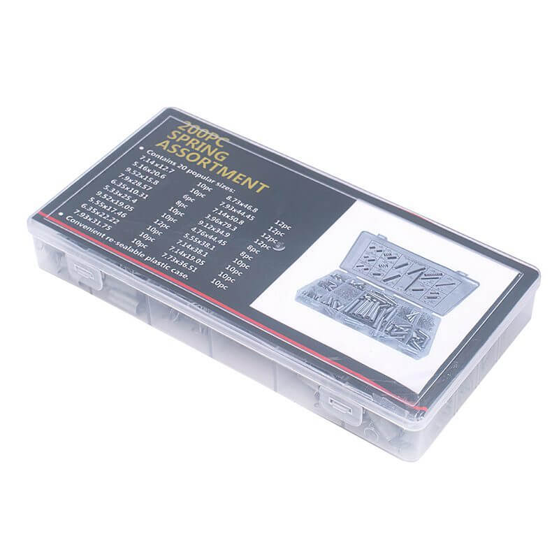 El Kit de Resortes contiene un total de 200 resortes de diferentes tamaños, están incluidos en un estuche sellable de plástico con separadores para mantener el kit organizado. El kit incluye un total de 20 tipos de resortes, divididos entre compresión y extensión, el estuche incluye una guía de referencia visual que contiene las dimensiones aproximadas del resorte y su ubicación en el kit.