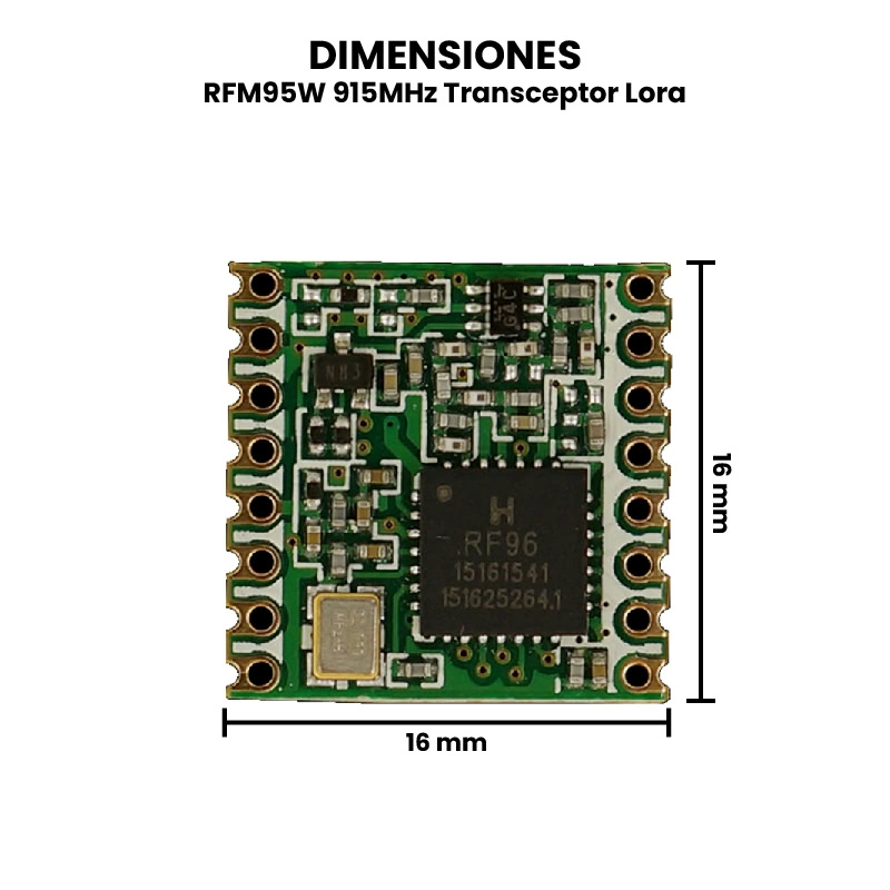 El RFM95W 915 MHz Transceptor LoRa es un módulo de comunicación inalámbrica de largo alcance basado en la tecnología LoRa (Long Range), diseñada para transmitir y recibir datos a bajas tasas pero con gran cobertura y alta inmunidad al ruido. Su funcionamiento se basa en la modulación LoRa que emplea técnicas de espectro ensanchado por chirp, lo cual permite alcanzar distancias de varios kilómetros con bajo consumo energético, incluso en entornos con interferencias. Opera en la banda ISM de 915 MHz y se comunica con microcontroladores mediante una interfaz SPI, desde la cual se configuran parámetros como frecuencia, potencia de transmisión y velocidad de datos.