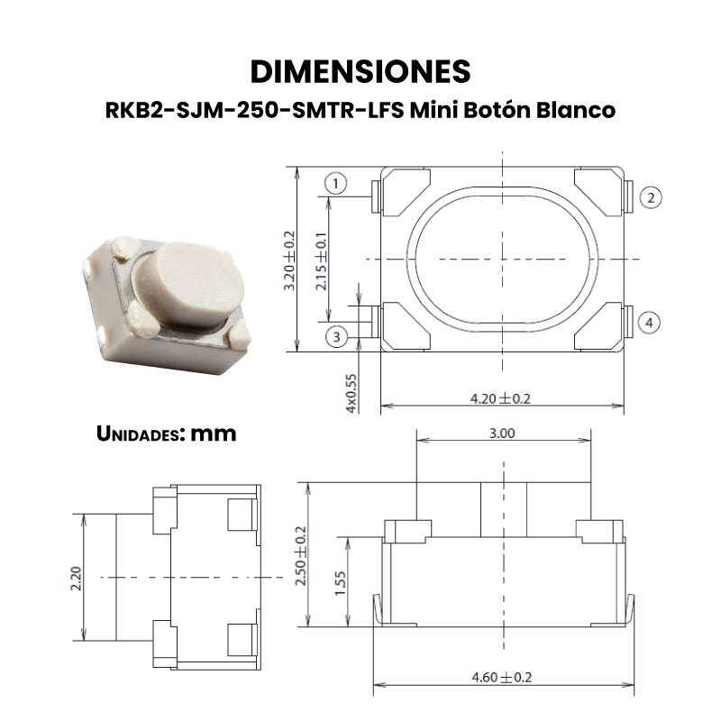 El RKB2-SJM-250-SMTR-LFS Mini Botón SMD, es un interruptor color blanco normalmente abierto SPST de tamaño compacto y una larga vida útil de hasta 100 000 ciclo. Soporta Voltajes de hasta 12 VDC y corrientes de hasta 50mA.