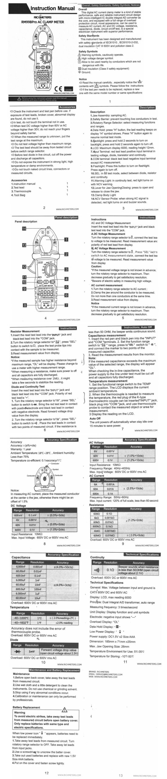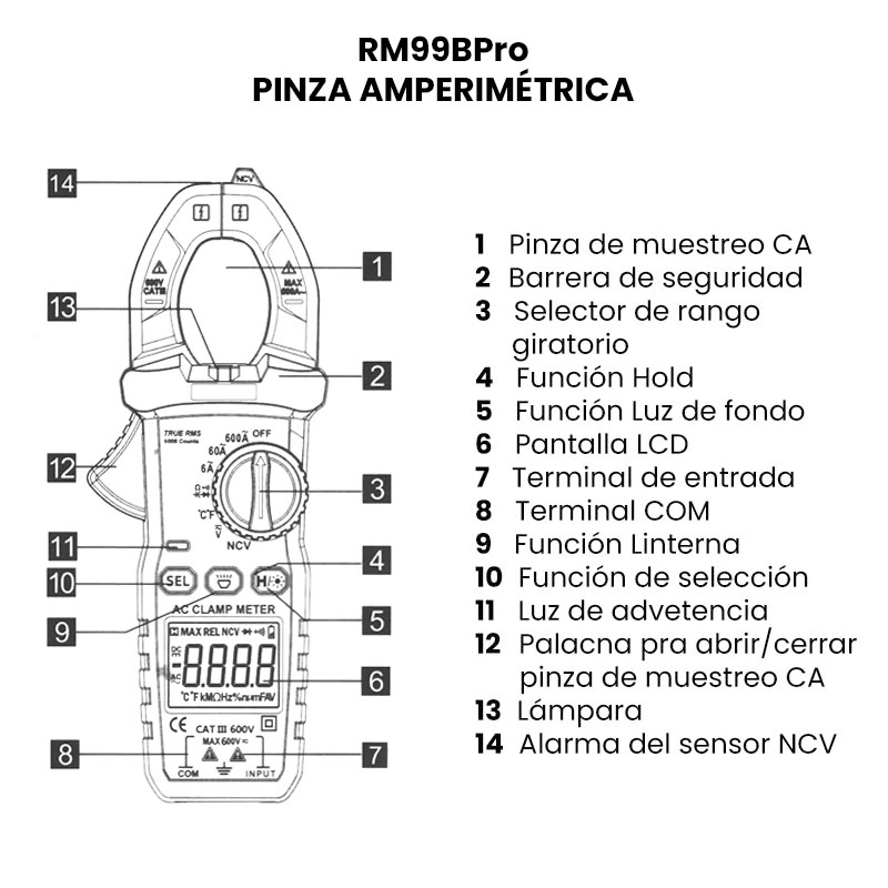 La RM99BPro Pinza Amperimétrica Digital o también denominada pinza voltamperométrica, es un instrumento eléctrico portátil para medir directamente magnitudes eléctricas activas, con precisión, rapidez y seguridad en particular la intensidad de corriente alterna sin necesidad de interrumpir o intercalar algún elemento en el circuito a medir. Incluye puntas y termocupla tipo K.