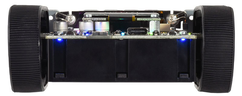 El Zumo 2040 tiene 16 MB (128 Mbit) de memoria flash que viene precargada con un intérprete MicroPython, por lo que puede comenzar de inmediato conectándolo a su puerto USB-C y editando los programas Python de ejemplo incluidos. Para los usuarios avanzados que quieran personalizar o mejorar sus robots con periféricos adicionales, se puede acceder a los rieles de alimentación del robot y a las líneas de E/S del microcontrolador a través de orificios pasantes espaciados a 0,1″ a lo largo de los lados y el frente de la placa principal. Un conector compatible con JST SH de 4 pines proporciona acceso al bus I2C0 del RP2040 y se puede utilizar con muchos dispositivos Sparkfun Qwiic y Adafruit STEMMA QT.