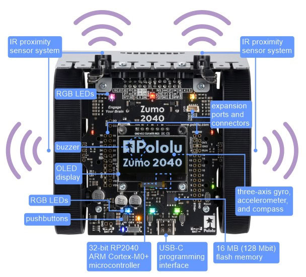 El Zumo 2040 cuenta con dos controladores de motor de puente H y una variedad de sensores integrados, incluido un par de codificadores de cuadratura para el control de motores de bucle cerrado, una unidad de medición inercial completa (acelerómetro de 3 ejes, giroscopio y magnetómetro), cinco sensores de reflectancia orientados hacia abajo para seguimiento de líneas o detección de bordes, y sensores de proximidad frontales y laterales para detección de obstáculos y medición de distancia. Tres botones integrados ofrecen una interfaz conveniente para la entrada del usuario, y una pantalla OLED gráfica de 128 × 64, un zumbador y seis LED RGB permiten que el robot brinde retroalimentación.
