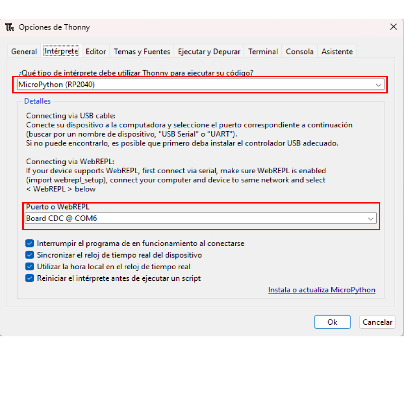 En tipo de interprete seleccionamos MicroPython (RP2040) y el puerto asignado al dispositivo.