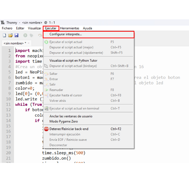 Para configurar el RP2040-Zero nos dirigimos a la ruta de Ejecutar>Configurar interprete…