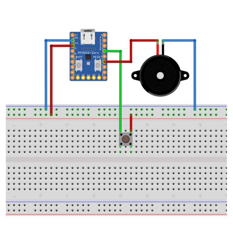 Realizaremos un circuito básico con el RP2040-Zero donde cada vez que oprimimos el botón cambiamos el color del WS2812 RGB LED integrado en la PCB del GPIO 16 y activar un serie de zumbidos.