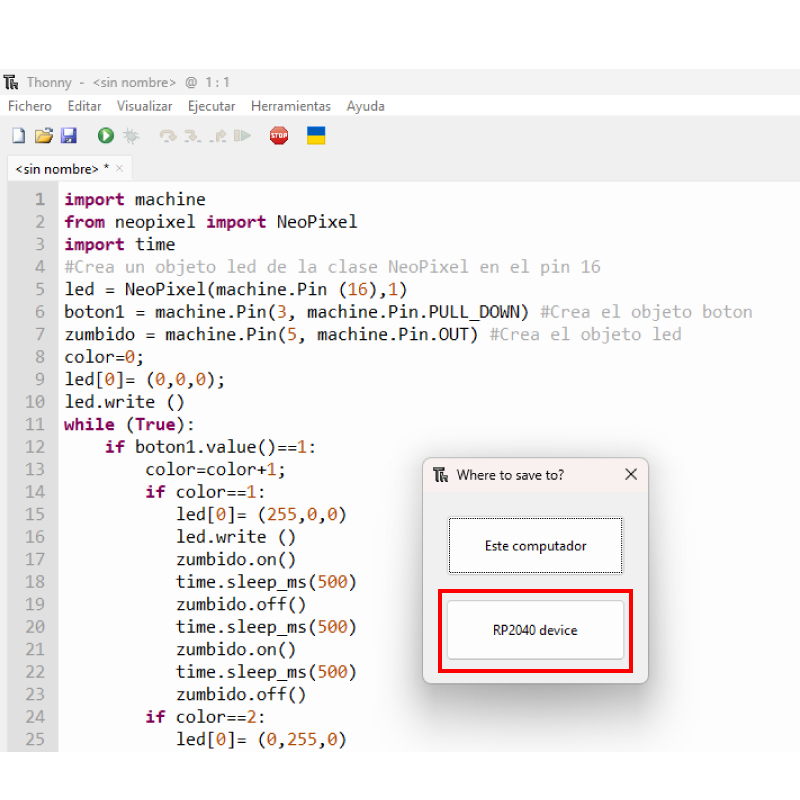 Guardaremos el script y seleccionaremos RP2040 device