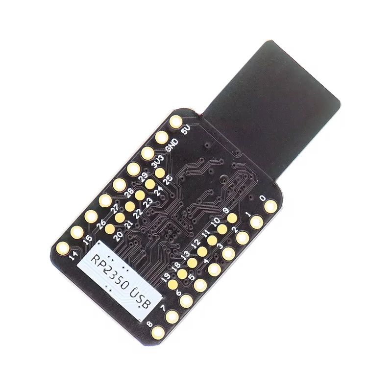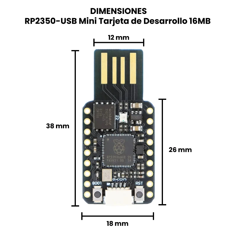 La RP2350-USB Mini Tarjeta de Desarrollo 16MB es una placa basada en el microcontrolador RP2350 compatible con MicroPython en IDEs como Thonny; pensada para proyectos embebidos compactos, ya que esta lista para conectar por USB sin circuitos extra al poseer una conexión integrada en su PCB que aprovecha el USB nativo del integrado.