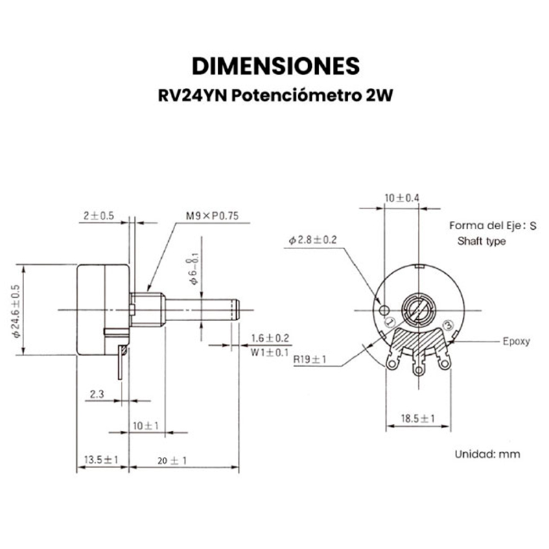 Los RV24YN Potenciómetros están disponibles en valores de 1kΩ, 5kΩ y 10kΩ, Este tipo de resistencias variables cuentan con un diseño y construcción robusta por lo que son resistentes, tienen una larga vida útil y un funcionamiento estable en entornos diversos, además ofrecen una funcionalidad confiable y consistente en una amplia variedad de aplicaciones. Tienen una potencia nominal de 0.25 W, por lo que son capaces de manejar corrientes y voltajes significativos sin comprometer su rendimiento, tienen un rango de resistencia y precisión alto, además cuentan con una alta resistencia mecánica y son resistentes a la corrosión.