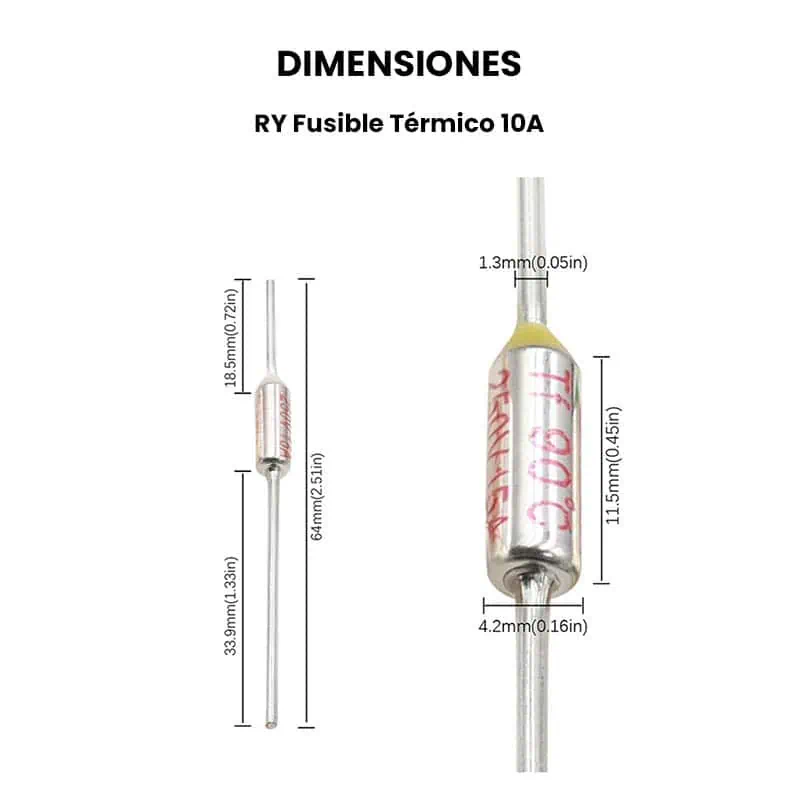 El RY Fusible Térmico 10A es un dispositivo que interrumpe de manera permanente el paso de corriente eléctrica cuando detecta que la temperatura supera su capacidad, de esta forma protege aparatos eléctricos de sobrecalentamiento. A diferencia de un fusible eléctrico común que reacciona al exceso de corriente, este reacciona principalmente al exceso de calor.