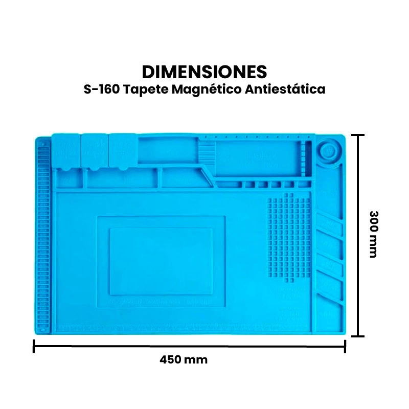 El S-160 Tapete Magnético Antiestática está diseñado para trabajos de mantenimiento y reparación de tarjetas electrónicas. Fabricado en silicón de alta densidad con propiedades ESD-safe, ofrece una superficie segura para manipular componentes sensibles.