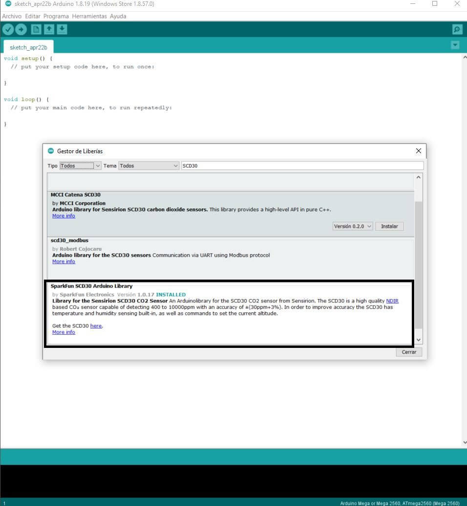 #include <Wire.h> //La libreria wire en las tarjetas UNO utiliza las terminales A4-(SDA), A5-(SCL) #include "SparkFun_SCD30_Arduino_Library.h" SCD30 airSensor; void setup() { // Inicializamos el puerto serial es importante que esta velocidad corresponda // con la del puerto serial cuando se realice la lectura. Serial.begin(115200); Serial.println("SCD30 ejemplo"); // Declaramos como entrada el pin de PWM Wire.begin(); if(airSensor.begin() == false) { Serial.print(""Sensor no detectado, revisa tus conexiones""); while (1); } //El sensor estará listo para transmitir datos cada 2 segundos } void loop() { //si el sensor de aire tiene datos disponibles los escribe en el puerto serial if (airSensor.dataAvailable()) { Serial.print("co2(ppm):"); Serial.print(airSensor.getCO2()); Serial.print(" temp(C):"); Serial.print(airSensor.getTemperature(), 1); Serial.print(" humedad(%):"); Serial.print(airSensor.getHumidity(), 1); Serial.println(); } else Serial.println("Esperando datos"); delay(5000); }