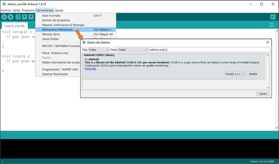 Instala la librería “Adafruit_CCS811” desde la pestaña de Herramientas selecciona Administrar Bibliotecas, que te permite acceder al Gestor de Librerías, donde puedes buscar por nombre la librería y te dará el estatus de la librería, si no está instalada, da clic en instalar del lado derecho.