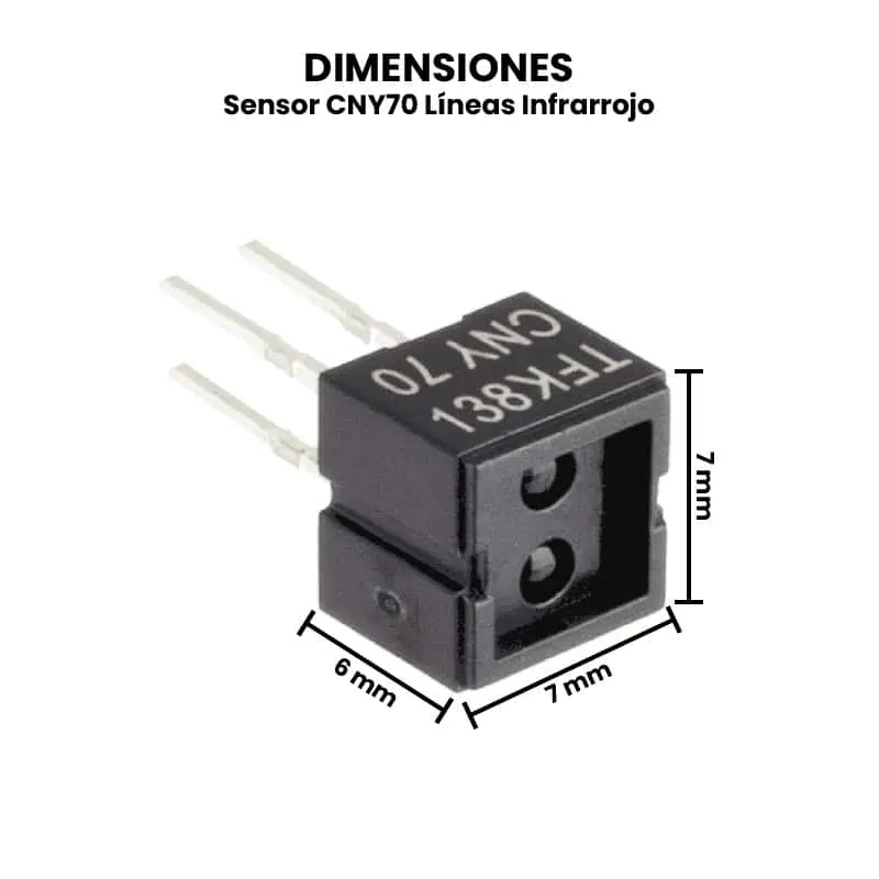 El sensor CNY70 es un módulo óptico que funciona mediante luz infrarroja para detectar líneas u objetos cercanos. Este sensor integra un emisor LED infrarrojo y un fototransistor en un solo encapsulado. El funcionamiento se basa en el principio de reflexión: el LED emite luz infrarroja hacia una superficie, y si esta es clara (como una línea blanca), la luz se refleja y es captada por el fototransistor; si la superficie es oscura (como una línea negra), la luz no se refleja y el fototransistor no la detecta. Esta diferencia en la cantidad de luz reflejada permite al sensor distinguir entre áreas claras y oscuras, lo que es ideal para seguir trayectorias marcadas sobre el suelo. El CNY70 entrega una señal analógica o digital (dependiendo del circuito en el que se conecte) que puede ser procesada por un microcontrolador para tomar decisiones.