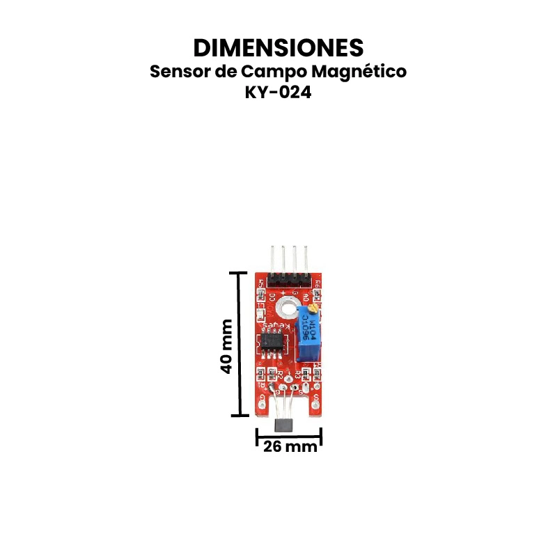 El sensor de campo magnético KY-024 funciona mediante un sensor de efecto Hall lineal, que genera una señal eléctrica proporcional a la intensidad del campo magnético que lo rodea. Cuando un imán u otra fuente de campo magnético se acerca al sensor, este detecta la variación del campo y produce una salida analógica que varía en función de la fuerza magnética detectada. Además, el módulo incluye un comparador LM393 que convierte esta señal analógica en una salida digital, la cual se activa (pasa de bajo a alto o viceversa) cuando el campo magnético supera un umbral previamente ajustado mediante un potenciómetro integrado.