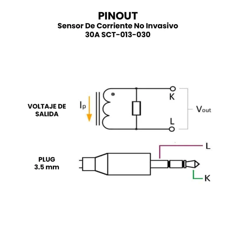 El sensor de corriente no invasivo SCT-013-030 es un transformador de corriente tipo “clamp” o pinza, diseñado para medir corrientes alternas (AC) de hasta 30 amperios sin necesidad de interrumpir el circuito eléctrico, lo que lo hace ideal para aplicaciones de monitoreo seguro y no invasivo. Su funcionamiento se basa en el principio de inducción electromagnética: al colocar la pinza alrededor de un conductor por el que fluye corriente, se genera una señal de salida proporcional, típicamente una señal de voltaje (0 a 1 V RMS), que puede ser leída por un convertidor analógico a digital (ADC). Esta señal es segura para trabajar con microcontroladores, ya que el modelo SCT-013-030 incluye un divisor de voltaje interno.