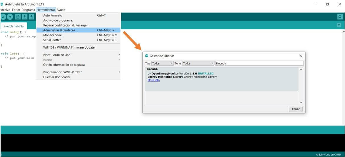 a) Instala la librería “EmonLib” desde la pestaña de Herramientas puedes seleccionar Administrar Bibliotecas, que te permite acceder al Gestor de Librerías, donde puedes buscar por nombre la librería y te dará el estatus de la librería, si no está instalada, aparecerá la opción de instalar del lado derecho.