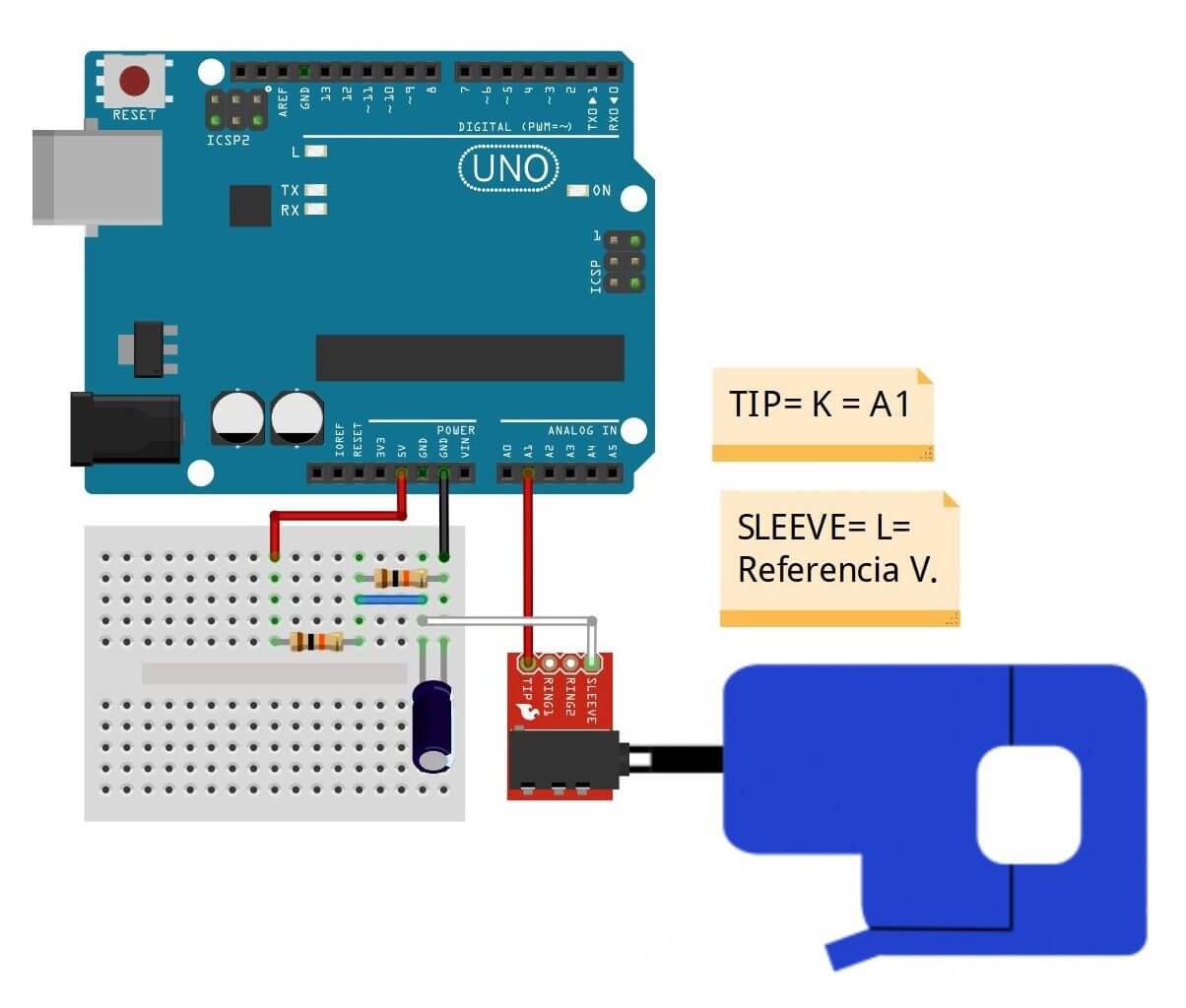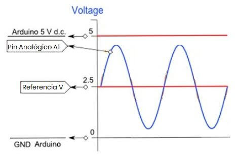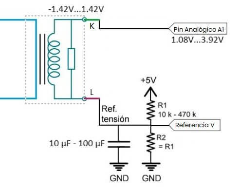 Realizaremos las conexiones de un circuito que nos permite añadir un offset de 2.5 V y como la salida del sensor es de 1 Vrms, el rango final de voltaje pico (Vrms multiplicado por √2) de la señal es de 1.08 V a 3.92 V, que es compatible con el rango de las entradas analógicas de un Arduino alimentado a 5 V.