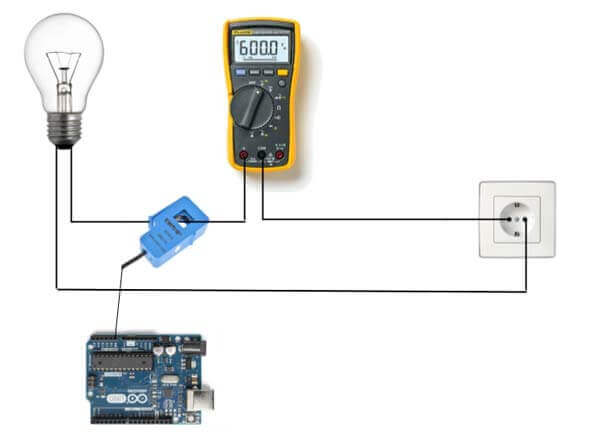 El siguiente código de ejemplo convierte los datos del sensor que ingresan por la entrada analógica A0 en el valor de corriente correspondiente a la medición mediante el uso de la librería “EmonLib” y lo envía por el puerto serie.