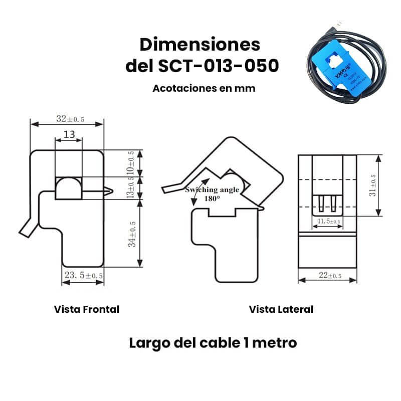 El Sensor de Corriente no invasivo 50 A SCT-013-050 es un dispositivo utilizado para medir el flujo de corriente en un circuito eléctrico de corriente alterna (CA) y tiene la capacidad de medir hasta 50 A sin contacto. El modelo STC-013-050V tiene una resistencia de carga interna, entregándonos una salida de voltaje de 1 Vrms. Solo enganche el sensor sobre el cable a medir y producirá un pequeño voltaje proporcional a la corriente del cable medido mediante una salida con conector jack de 3.5 mm.