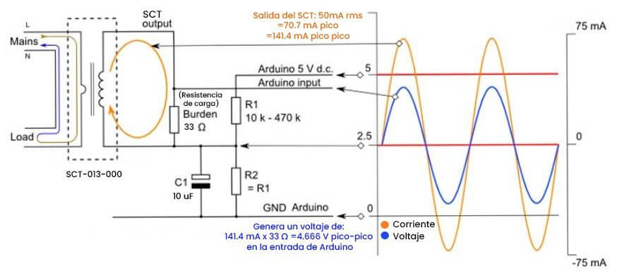 Conexión básica del SCT-013-000 con Arduino para medir la corriente en un conductor.