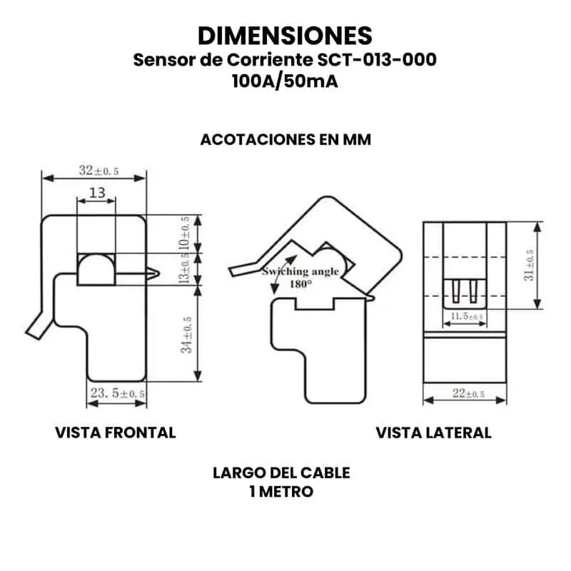 El Sensor de Corriente SCT-013-000 100A/50mA es un transformador de corriente tipo “clip” que permite medir la corriente alterna (CA) sin necesidad de interrumpir el circuito eléctrico. Su funcionamiento se basa en el principio de inducción electromagnética: cuando la corriente alterna fluye por el conductor que atraviesa el núcleo del sensor, se genera una corriente proporcional en el secundario del transformador. Este sensor entrega una señal de salida de 50 mA a su corriente máxima de 100 A, la cual puede convertirse en un voltaje medible mediante una resistencia de carga. Gracias a este diseño, el SCT-013-000 permite realizar mediciones seguras, precisas y sin contacto directo con la red eléctrica.