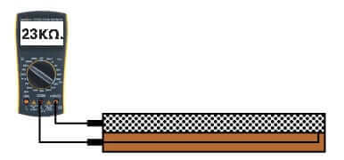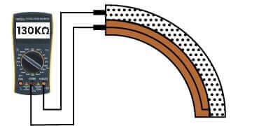 Cuando el sensor se separa de la tinta, las partículas conductoras se separan más, aumentando esta resistencia (a aproximadamente 20k – 30K Ω cuando el sensor se dobla a 90 °, como en el diagrama a continuación).
