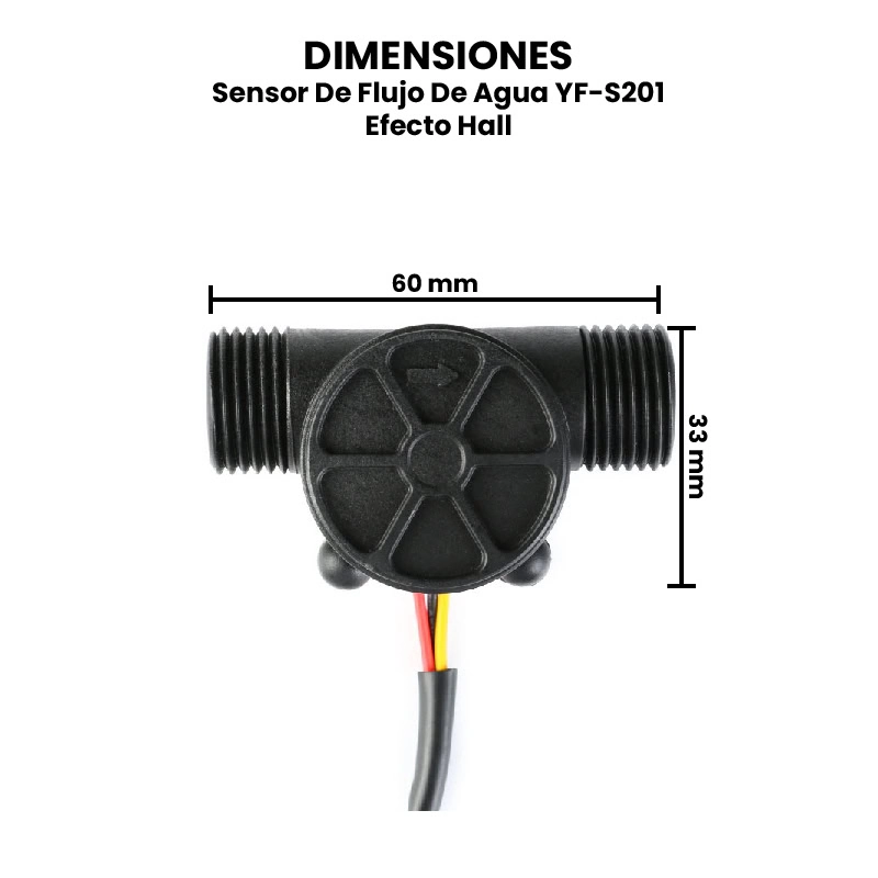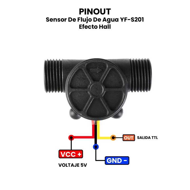 El Sensor de Flujo de Agua YF-S201 es un dispositivo electromecánico diseñado para medir la cantidad de agua que pasa a través de una tubería, utilizando el principio del efecto Hall. Este sensor cuenta con un rotor interno con aspas que gira cuando el agua fluye; al girar, interrumpe un campo magnético generado por un imán y un sensor de efecto Hall integrado. Cada vuelta del rotor genera un pulso eléctrico, y la cantidad de pulsos por unidad de tiempo es proporcional al caudal de agua.