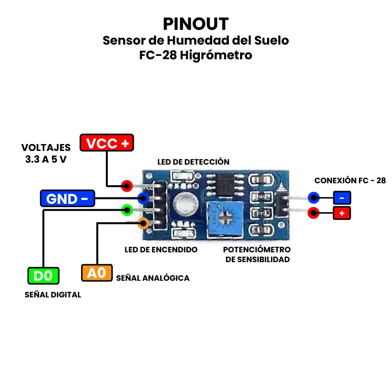 El sensor de humedad del suelo FC-28 Higrómetro es un dispositivo electrónico diseñado para medir el contenido de humedad en el suelo mediante la conductividad eléctrica. Este sensor consta de dos partes principales: una sonda con dos electrodos metálicos que se insertan en el suelo y una placa electrónica que interpreta la señal. Su funcionamiento se basa en la variación de resistencia eléctrica entre los electrodos: cuando el suelo está húmedo, la conductividad es mayor y la resistencia disminuye; cuando está seco, la resistencia aumenta. El FC-28 puede entregar una señal analógica proporcional al nivel de humedad y también una señal digital configurada mediante un potenciómetro en la placa, lo que permite activar alertas o sistemas de riego automatizados.