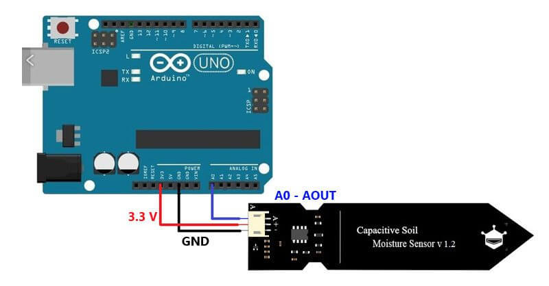Para usar este sensor con la tarjeta de Arduino usaremos una de las entradas analógicas (A0) conectaremos las GND y la alimentación del sensor desde el Arduino (3.3V) como se muestra en la siguiente imagen: