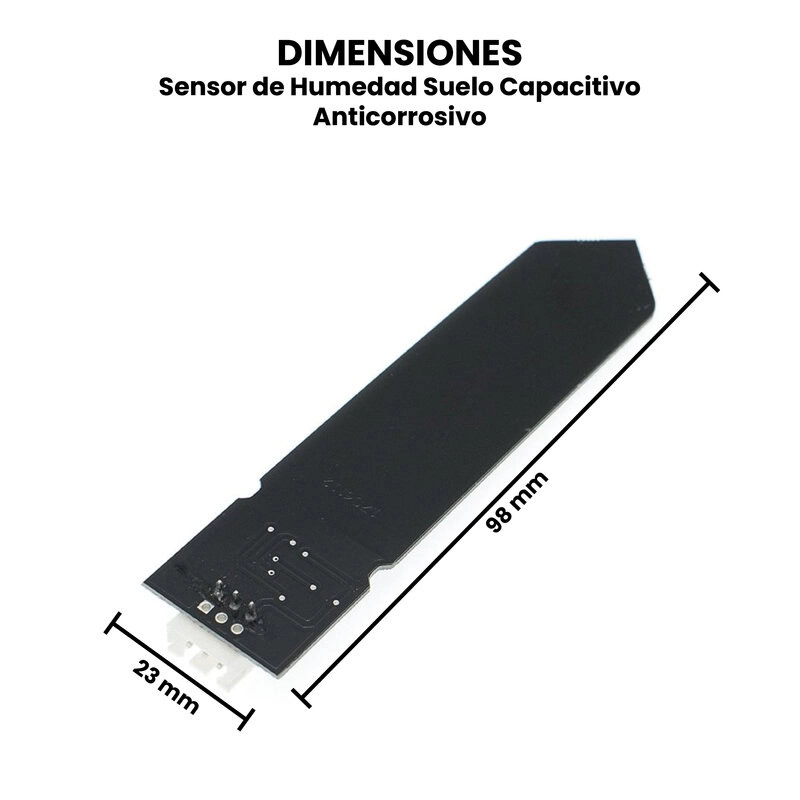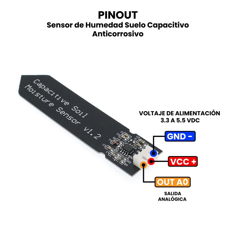 El Sensor de Humedad de Suelo Capacitivo Anticorrosivo se utiliza principalmente en sistemas de riego automático, agricultura de precisión, jardines inteligentes, macetas electrónicas, invernaderos y proyectos de monitoreo ambiental, ya que permite determinar con precisión cuándo el suelo necesita agua. Sus lecturas estables y duraderas lo hacen ideal para proyectos de automatización y ahorro de recursos hídricos. Además, es totalmente compatible con tarjetas de desarrollo como Arduino, ESP32, ESP8266, Raspberry Pi, PIC, STM32 y otros microcontroladores, lo que facilita su integración en sistemas de control inteligente para la gestión eficiente del riego y el cuidado de plantas. Este sensor tiene salida analógica, para usarlo con algún microcontrolador es necesario un conversor ADC (Analog to Digital Converter).