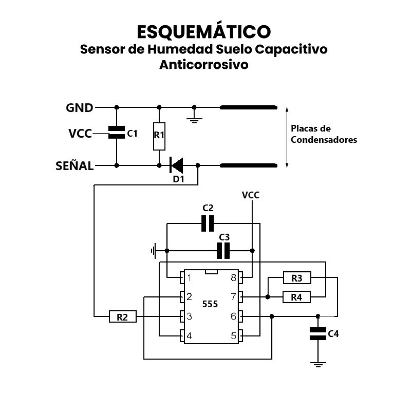 El Sensor de Humedad de Suelo Capacitivo Anticorrosivo es un dispositivo diseñado para medir el nivel de humedad presente en la tierra de manera precisa y duradera. A diferencia de los sensores resistivos, este sensor utiliza el principio de capacitancia, donde la variación en el contenido de agua del suelo altera la constante dieléctrica del mismo, modificando la señal de salida que el sensor entrega. Al no tener partes metálicas expuestas en contacto directo con la tierra, evita la corrosión y el desgaste prematuro, lo que garantiza una mayor vida útil y lecturas más estables, incluso en aplicaciones de uso continuo en sistemas de riego automático y proyectos de agricultura inteligente.