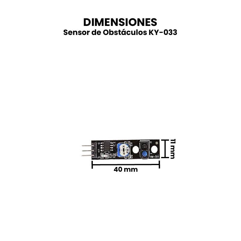 El Sensor de Obstáculos KY-033 infrarrojo o detector de línea es un dispositivo que detecta la presencia de un objeto mediante la reflexión que produce en la luz. El uso de luz infrarroja (IR) es simplemente para que esta no sea visible para los humanos. Actúa a distancias cortas, típicamente de 2 a 40 cm.