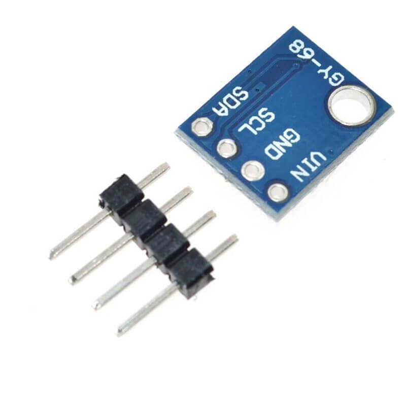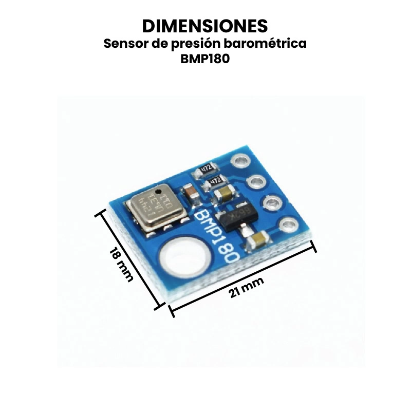 El BMP180 es un sensor digital de presión barométrica desarrollado por Bosch, diseñado para medir con alta precisión la presión atmosférica y, a partir de ella, estimar la altitud y realizar correcciones en mediciones ambientales. Este sensor utiliza un elemento piezorresistivo que detecta la presión del aire y un convertidor analógico a digital (ADC) de alta resolución que convierte esa información en datos digitales. Además, incorpora un microcontrolador interno que compensa automáticamente la temperatura y otros factores para mejorar la exactitud de la medición. El BMP180 puede medir presiones en un rango de 300 a 1100 hPa (hectopascales) con una precisión de hasta ±1 hPa y temperaturas de 0 a 65 °C, aunque funciona en un rango más amplio. Se comunica con microcontroladores a través del protocolo I2C (y en algunos casos SPI).