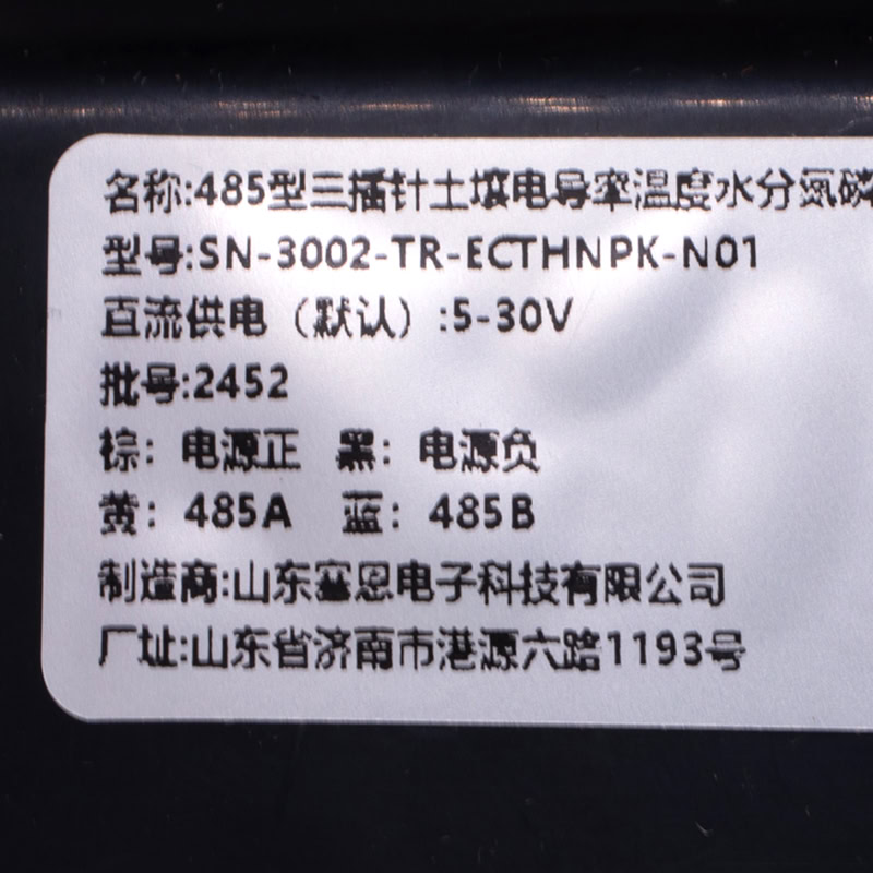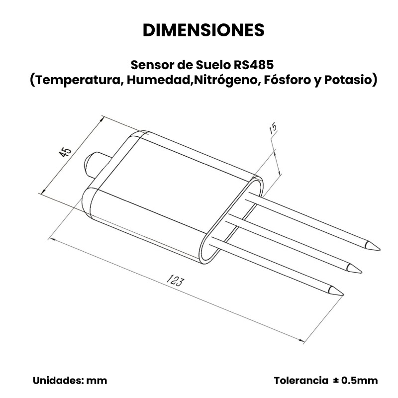 El Sensor de Suelo RS485 (Temperatura, Humedad, Nitrógeno, Fósforo y Potasio) es un dispositivo capaz de medir la concentración de los tres elementos químicos cruciales para la fertilidad del suelo que impactan directamente en el óptimo desarrollo de cultivos de todo tipo además de la temperatura y la humedad del suelo. El sensor cuenta con tres púas hechas de acero inoxidable que fungen como sondas. Dichas púas se clavan en el suelo circundante a las raíces de la planta para obtener las lecturas de Nitrógeno, Fósforo y Potasio, o si lo requiere, debido a su grado de protección IP68, el sensor puede operar completamente enterrado, además este sensor se puede comunicar con sistemas microcontrolados a grandes distancias debido a su interfaz RS485 (protocolo Modbus).