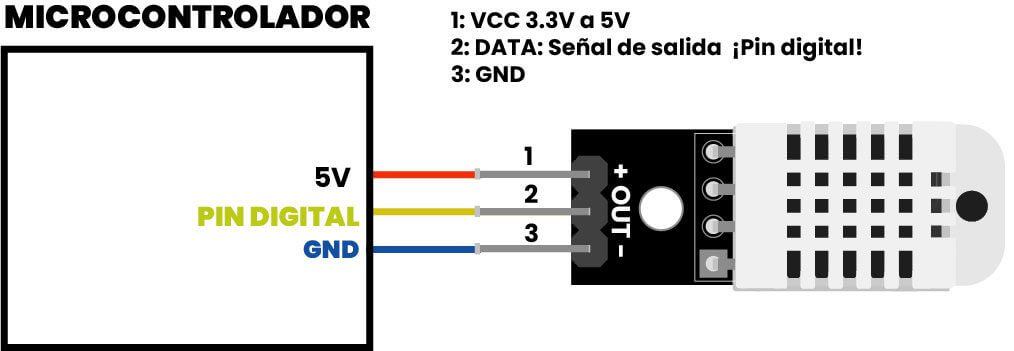 Solo es necesario conectar el pin VCC de alimentación a 3.3V o 5V, el pin GND a Tierra (0V), conectar el pin de OUT a un pin digital de un microcontrolador o tarjeta de desarrollo, es compatible con las placas de Arduino / Raspberry Pi / Nodemcu / ESP32 o de cualquier microcontrolador que tenga pines digitales. En la siguiente imagen se define como conectar el módulo DHT22 a un MCU: