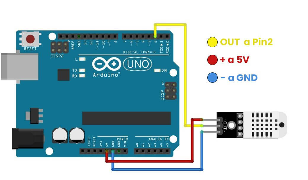 Conectar el módulo DHT22 a la placa Arduino uno, solo tienes que conectar el pin de OUT a un pin digital y alimentarlo con los 5V que proporciona la placa de arduino y por último conectar la terminal (-) a GND. En la siguiente imagen se muestra como realizar las conexiones entre el sensor y Arduino uno: