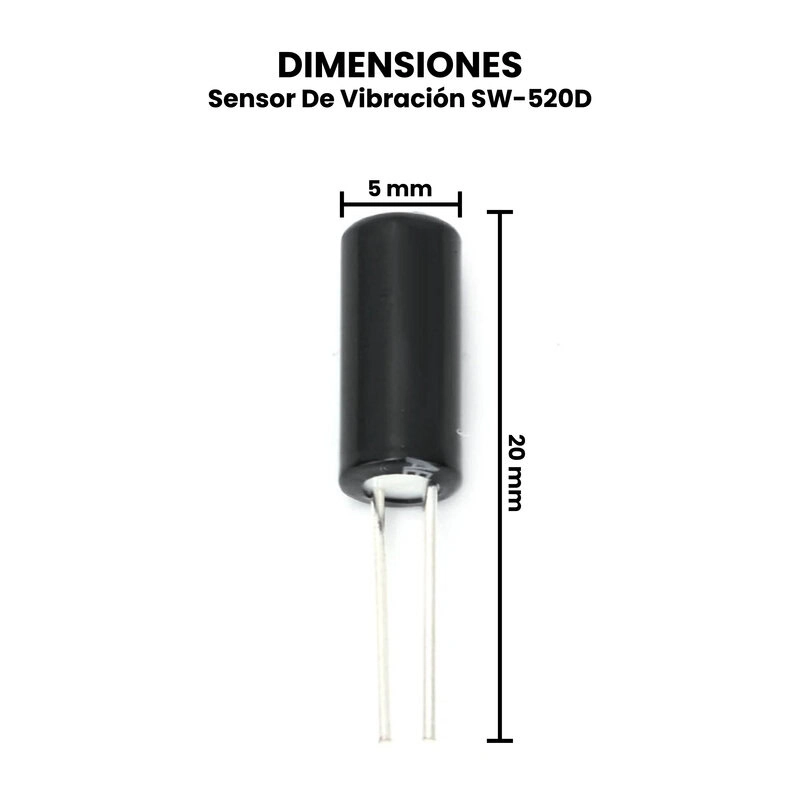 El SW-520D que se muestra en la foto es un sensor de inclinación y vibración tipo “roll-ball”, compuesto por un pequeño tubo metálico con una esfera conductora en su interior. Su funcionamiento se basa en que, cuando el sensor está en determinada posición o recibe vibraciones, la esfera interna hace contacto entre dos terminales, cerrando el circuito; al cambiar la inclinación o cesar el movimiento, la esfera se separa y el circuito queda abierto. Este tipo de sensor no permite saber el grado de inclinación del dispositivo, simplemente actúa como un sensor que se cierra a partir de una cierta inclinación.