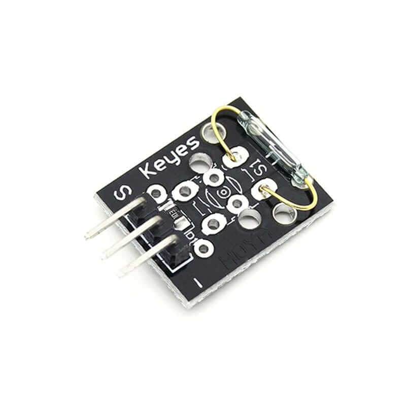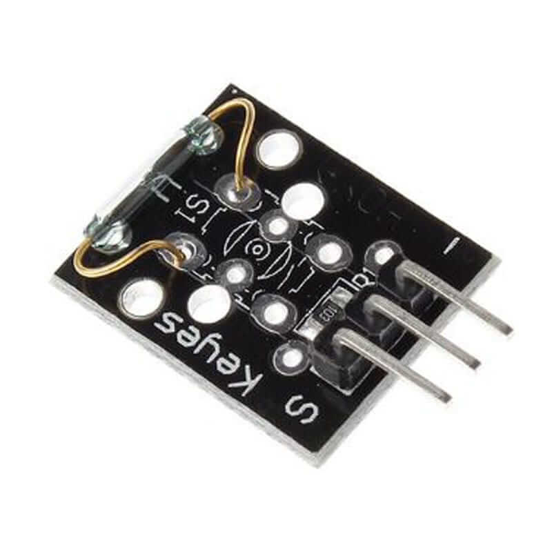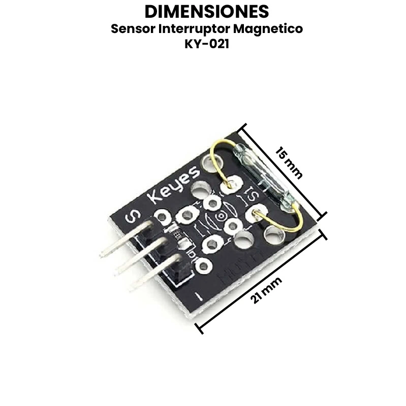 El KY-021 está compuesto por un interruptor de láminas (reed switch) dentro de una cápsula de vidrio, montado sobre una pequeña placa con tres pines:- S (Señal).