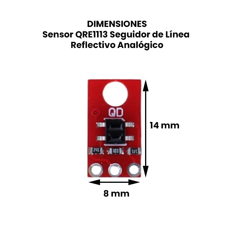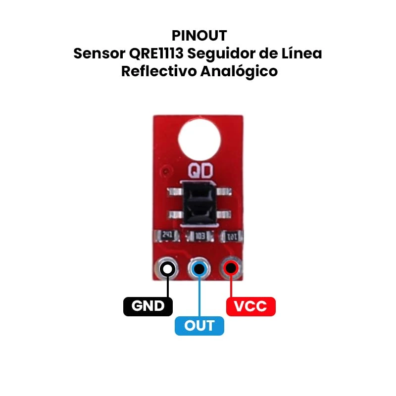 El Sensor QRE1113 cuenta con una salida analógica fácil de usar para usarlo en seguidor de linea reflectivo, que variará dependiendo de la cantidad de luz IR reflejada hacia el sensor.