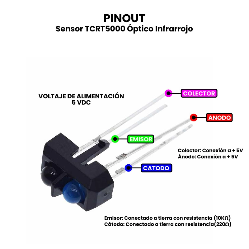 Nota: Si el sensor no es un módulo y estás usando el componente TCRT5000 suelto, necesitarás añadir resistencias externas para el LED IR y el fototransistor.