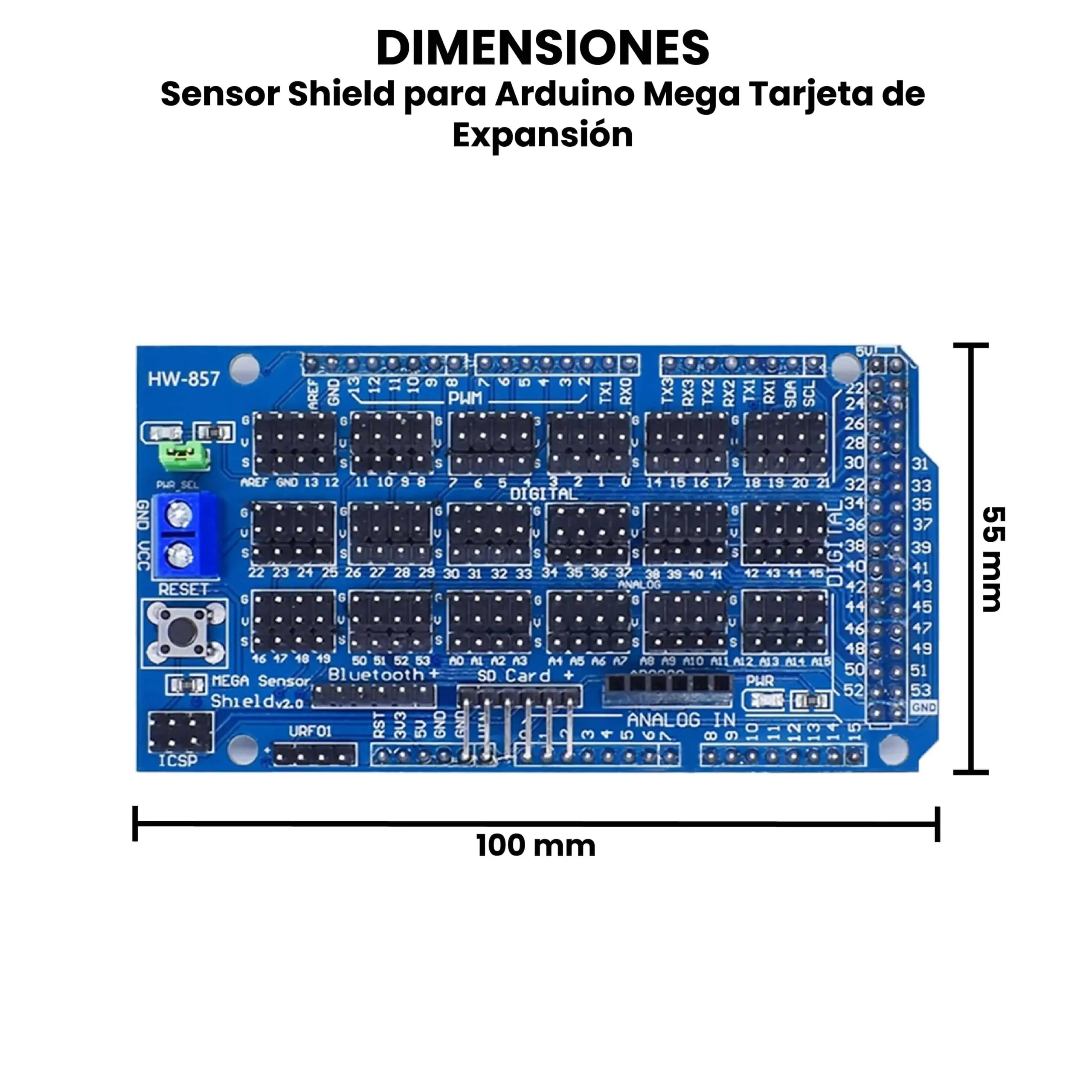 El Sensor Shield para Arduino Mega se utiliza principalmente para simplificar la conexión y control de múltiples sensores y actuadores en proyectos electrónicos y educativos. Sus aplicaciones incluyen robótica, brazos robóticos, vehículos autónomos, domótica, sistemas de monitoreo ambiental, proyectos IoT y automatización Es compatible principalmente con la tarjeta Arduino Mega 2560, aunque también puede funcionar con otras placas que mantengan el mismo formato y distribución de pines del Mega.