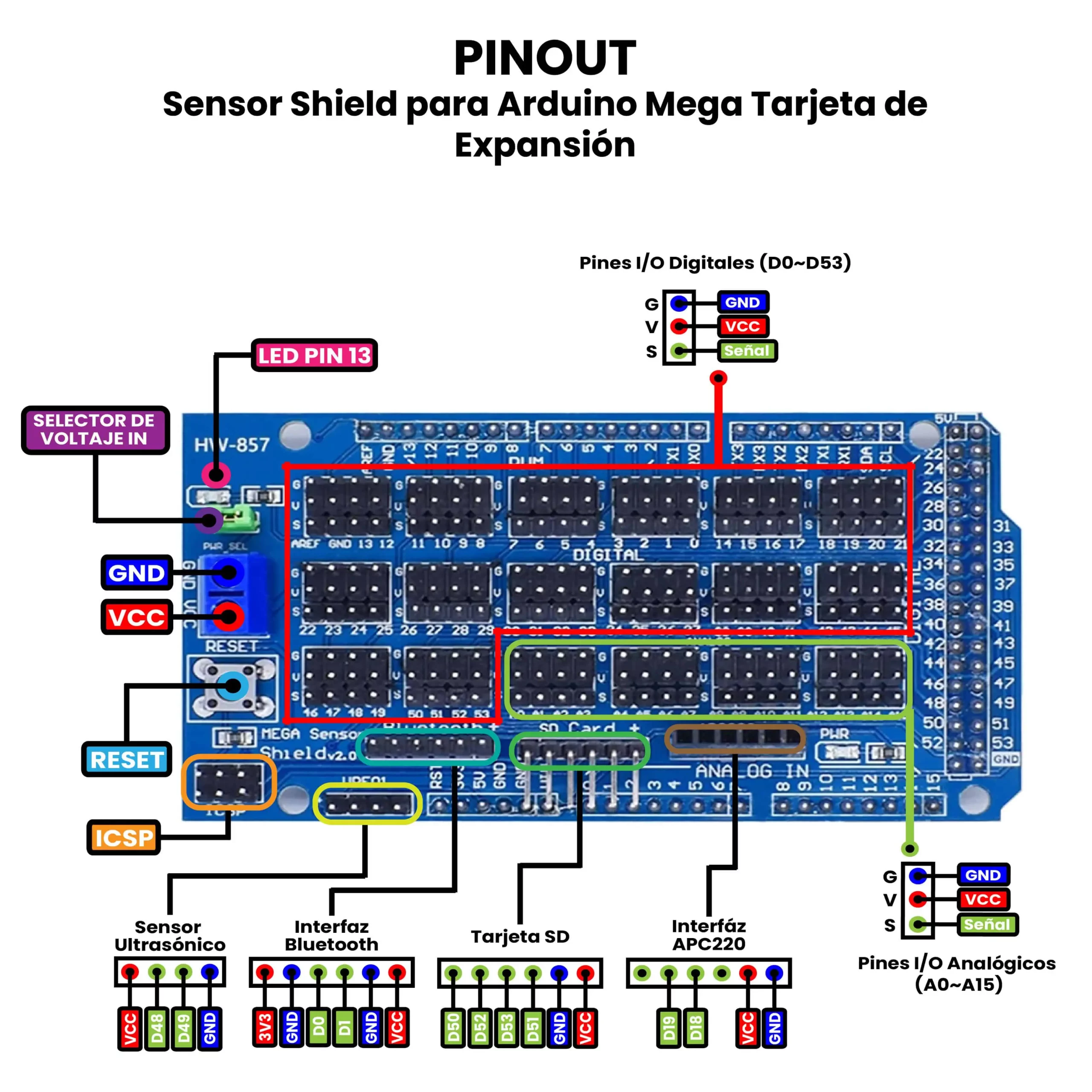 - 4 bloques de pines Analógicos (Vcc, GND y Señal).