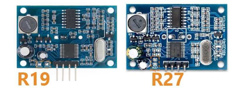 El puente R19 es similar al R27 encontrados en otros modelos JSN-SR04T se encuentra en el módulo junto a los pines. Se puede mantener abierto, soldar una resistencia de 47 kΩ en el medio o usar una resistencia de 120 kΩ. Con esta medida se determina el modo de funcionamiento diferente.